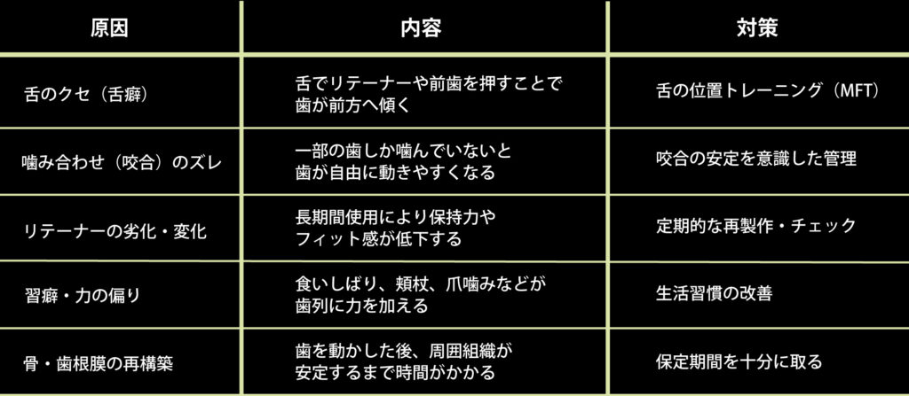 つまり、リテーナーそのものの性能よりも、“使い方”や“周囲の筋肉のバランス”が安定を左右するのです。